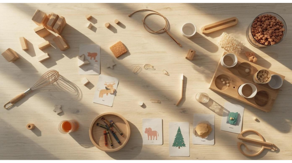 • Pripremljene police: Postavite materijale na dohvat deteta – puzzle, kocke, igračke koje podstiču logiku.